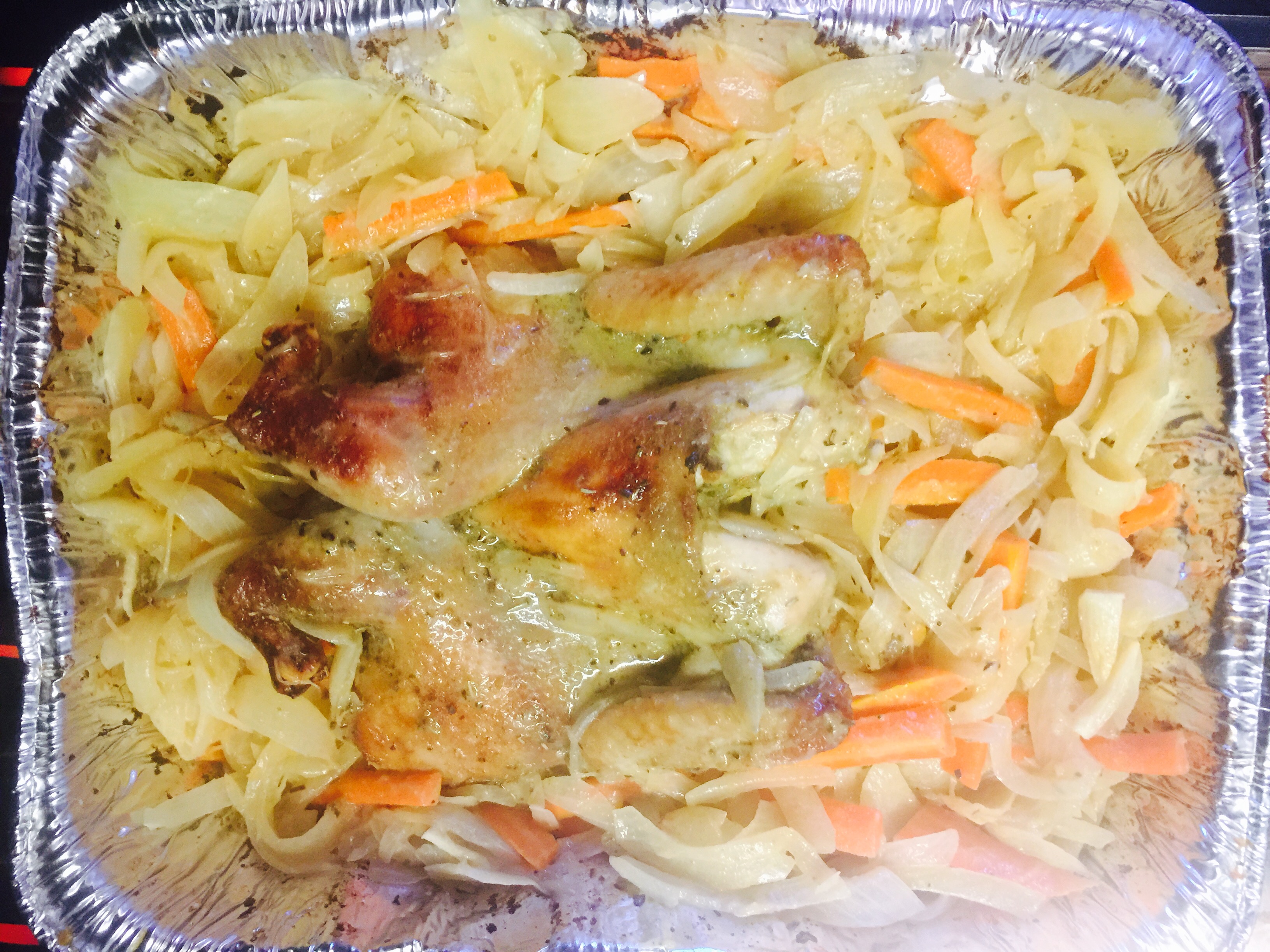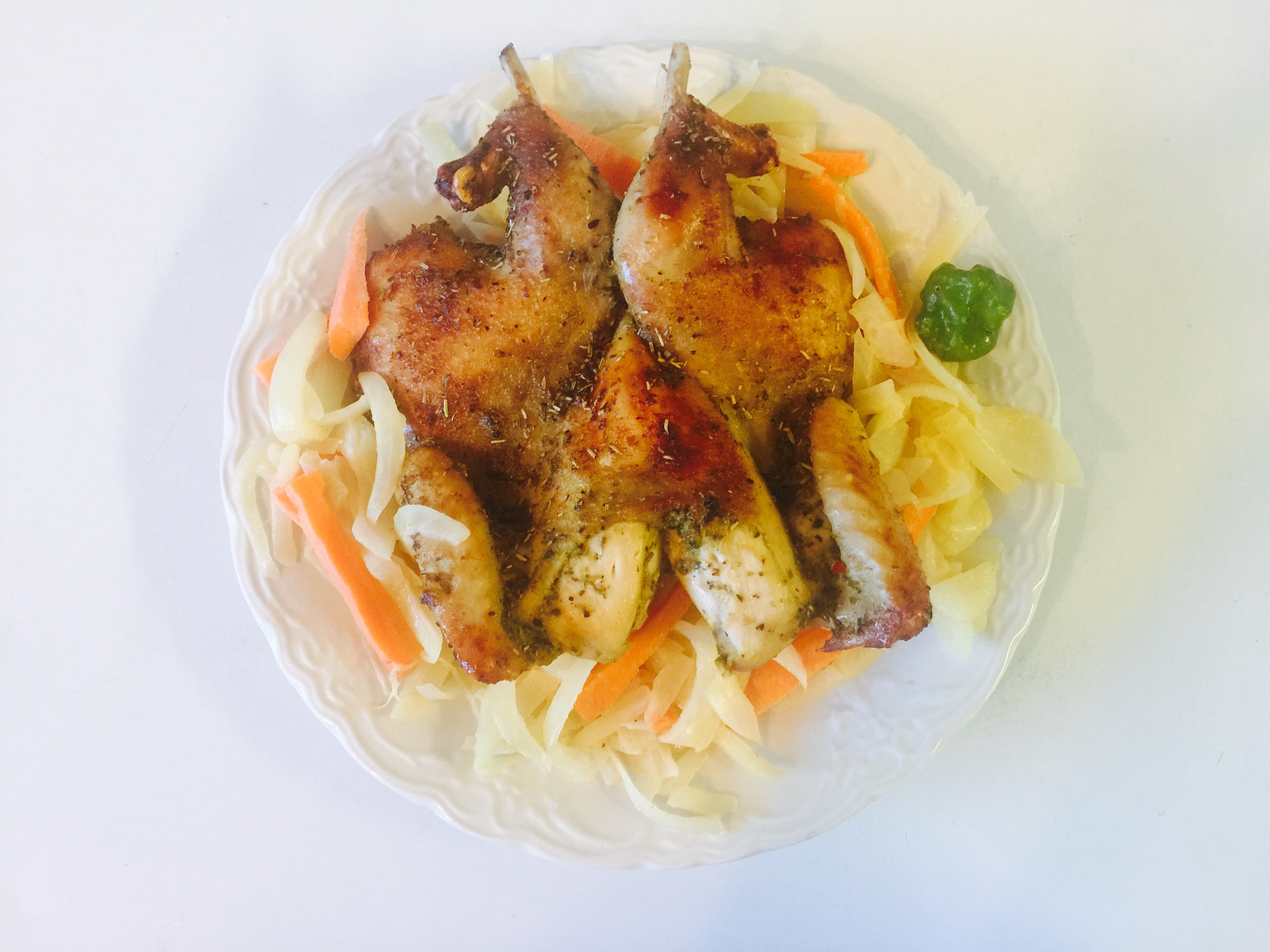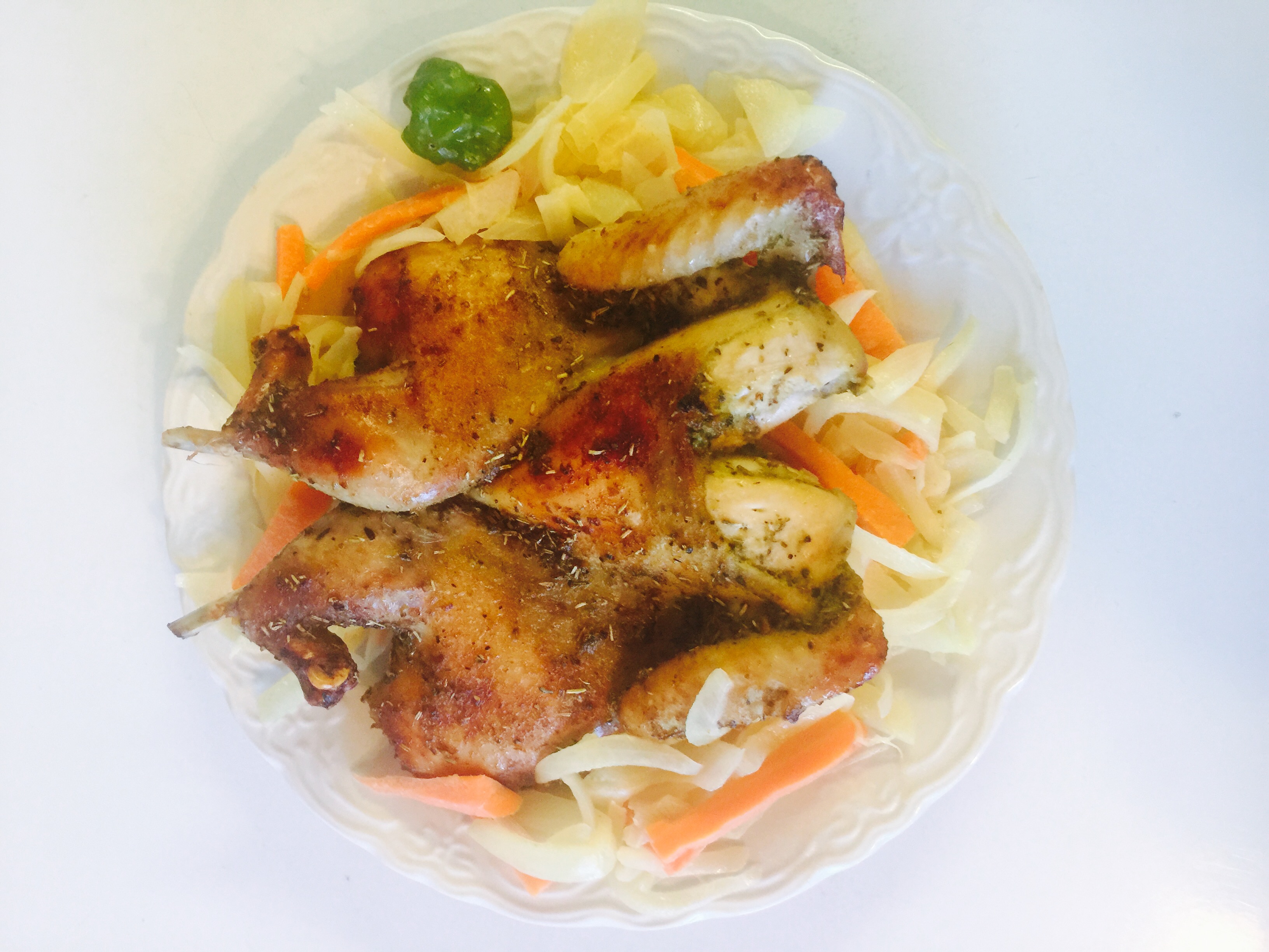 4. Rub whole Hen with marinade. Then Put Hen in a cast iron skillet or pan. Surround with onion and carrot marinated with Dijon mustard and lemon juice.